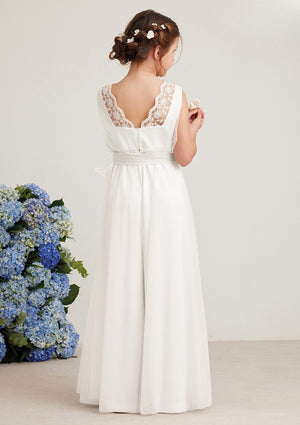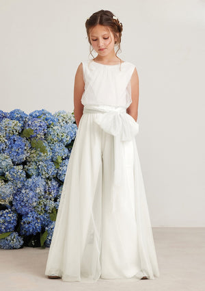 Conjunto para comunión en color blanco de Amaya. Mono sin mangas con cuello redondo y detalle de encaje, realzado con tul de aire romántico en blanco o verde agua. La espalda abierta luce encaje de flores. Se completa con cinturón intercambiable (blanco, verde agua, lila o rosa) e incluye horquillas para el pelo a juego. Pieza cuidada y artesanal, fiel al estilo romántico de la firma.