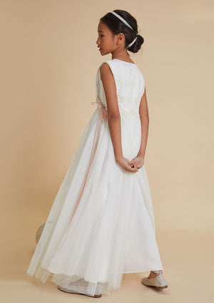 Conjunto para comunión en color blanco de Amaya. Mono sin mangas y cuello redondo, con encaje floral y apliques de mariposas en tono champán. Lleva una sobrefalda de tul blanco de aire romántico. La espalda es cerrada y está decorada con encaje y mariposas. Incluye cinturón blanco. Fiel al estilo romántico de la firma, con gran cuidado por los detalles y la artesanía.