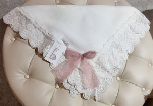 Manta de bautizo beige, ligera y muy cómoda, con acabado de encaje y lazo de tela satinada en color rosa.