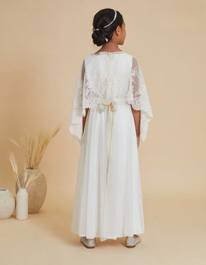 Enterizo en tul blanco, sin mangas y de cuello redondo, con espalda cerrada. La cintura se realza con un cinturón adornado con flores. Incluye capa desmontable de manga larga con delicado bordado floral en encaje. Un conjunto romántico y muy elegante, fiel al sello de Amaya.