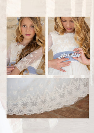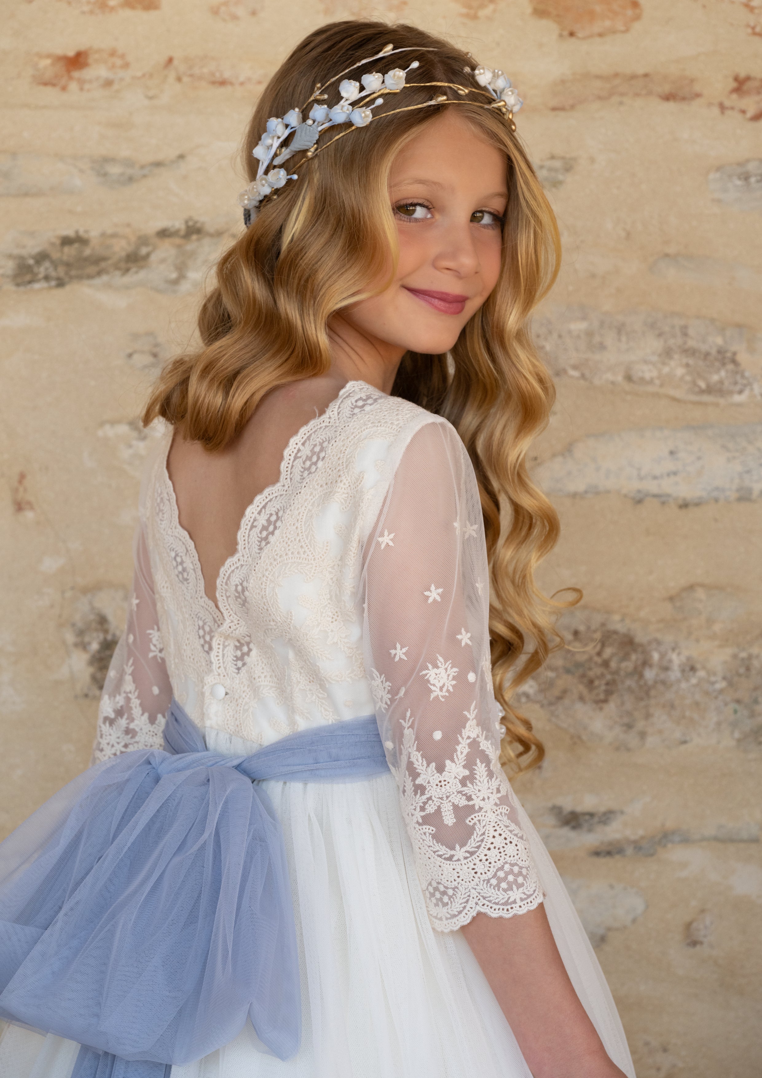 Vestido de comunión de la marca Manuela Macías, color blanco con lazado azul, de media manga, con una falda larga, bordado del bajo de encaje que calle hasta el suelo. Es una prenda con detalles como el cuello cuadrado del encaje bordado exclusivo y elegante del color crudo para dar el aire bohemio. El vestido es pura delicadeza que tiene mangas de tela ligera y transparente decoradas encaje que le da un ambiente de lujo, espalda abierta con escote V, decorado encaje y cierre con botones. Este vestido tiene una corona de flores del mismo estilo espectacular.
