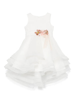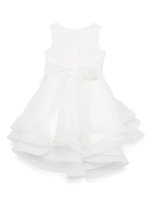 Vestido para eventos sociales en color blanco, sin mangas y con falda corta muy vaporosa. Presenta múltiples capas con volantes que aportan volumen y un aire de lujo. La cintura se realza con un lazo de tul rematado con flores en el centro, creando un look exclusivo y elegante. Diseño de Mimilú, con fabricación artesanal en España y materiales de alta calidad.