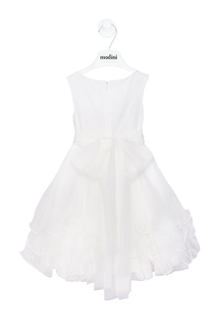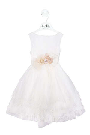 Vestido corto ideal para eventos sociales en tono crudo, sin mangas y con falda corta y vaporosa de volantes. La cintura se realza con un lazo de tul adornado con flores centrales. Una pieza elegante y delicada de la marca Mimilú, con acabados de alta calidad y confección artesanal en Española.
