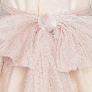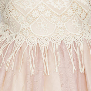 Vestido midi sin mangas tono beige, cuello cuadrado y falda acampanada de tres capas con tul tono rosa. La parte delantera del cuerpo decorada con encaje beige y bordados. Cierre con botones en la parte posterior. Cinturón que se ata en un lazo en la espalda. Un diseño elegante de la marca Marla, con acabados de alta calidad y confección artesanal Española.