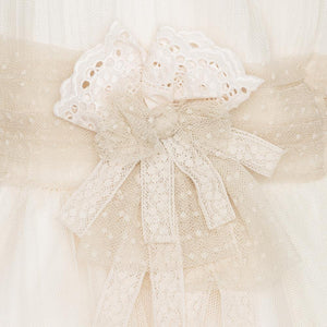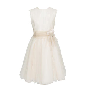 Vestido midi sin mangas tono beige, cuello redondo y falda acampanada de capas con tul. Espalda cerrada y cierre con botones. La cintura se realiza con cinturón de tul decorado con flores tono beige. Cinturón que se ata en un lazo en la espalda. Un diseño elegante de la marca Marla, con acabados de alta calidad y confección artesanal Española.