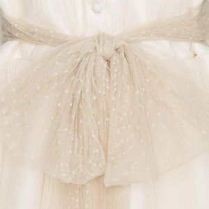 Vestido tono beige con cinturón de tul para eventos sociales