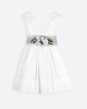 Vestido para eventos especiales, confeccionado en tul bordado. Diseño sin mangas con encaje en color blanco y tejido plumeti, cintura destacada con lazo en verde aguamarina adornado con flores y espalda abierta de efecto deslumbrante. Un estilo romántico con detalles artesanales.