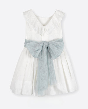 Vestido en tul bordado con plumeti y lazo aguamarina