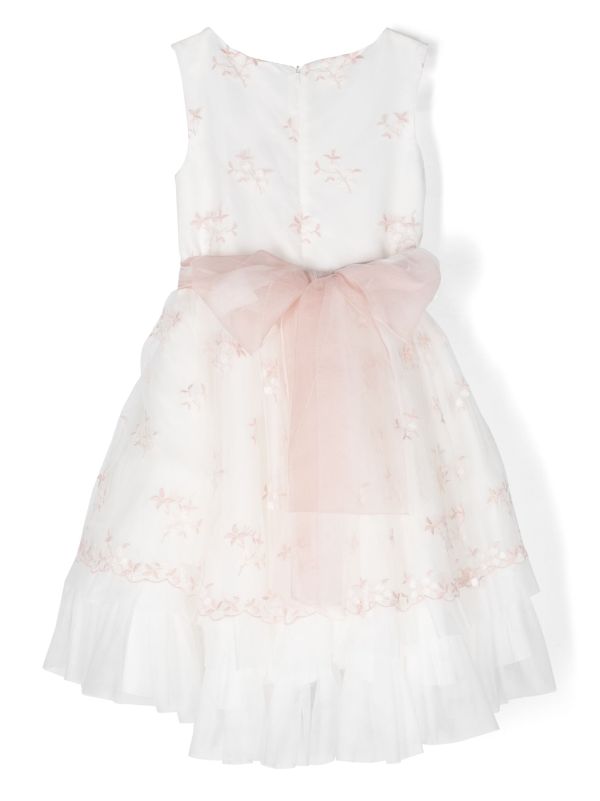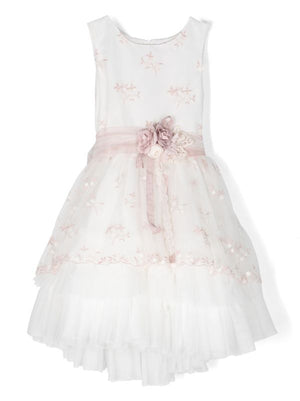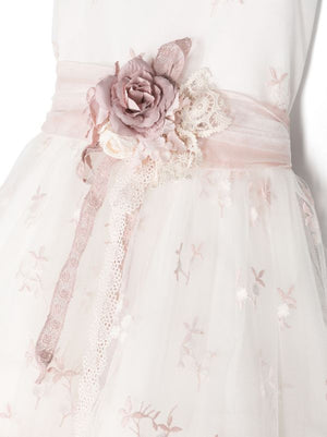 Vestido corto para eventos sociales en color blanco y rosa, sin mangas y con cuello redondo. La cintura luce un lazo de tul en rosa empolvado con flores al centro. La falda de tul, formada por varias capas, aporta volumen y movimiento para un efecto elegante. Cierre posterior con cremallera oculta. Pieza de acabado artesanal de la marca Mimilú, confeccionado en España.