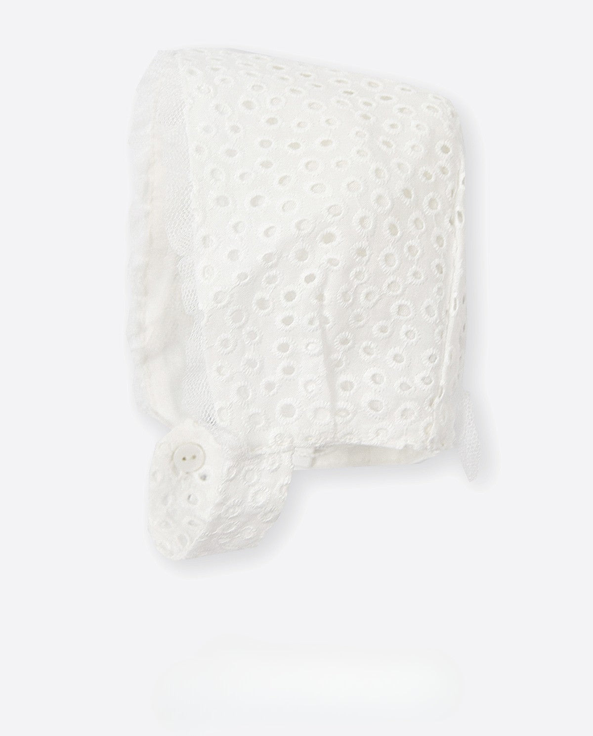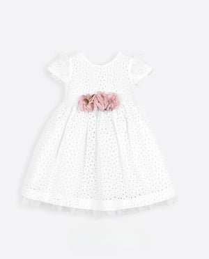 Vestido para bautizo, confeccionado en algodón. Diseño sin mangas con volantes de tul en blanco y tejido a puntos, escote cerrado y lazo en la cintura adornado con flores en tono rosa. Un estilo romántico con detalles delicados y acabados de inspiración artesanal.