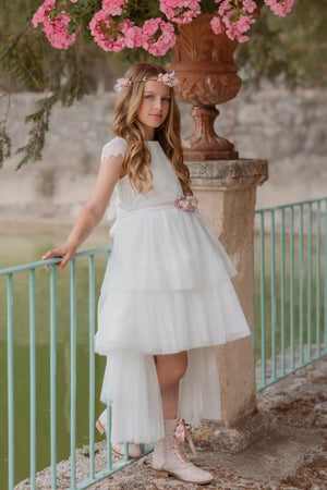 Vestido HIGH LOW de comunión blanco con falda tutú asimétrica y lazos