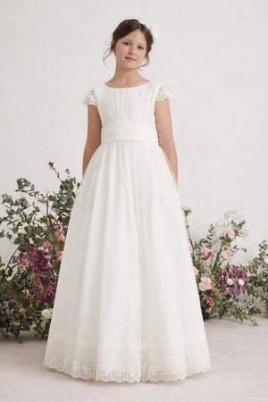Vestido para comunión en color blanco de la marca Amaya con falda completa. Presenta manga corta con un pequeño encaje delicado, cuello redondo y espalda con escote en V. Incorpora cinturón de tul blanco y gran lazo posterior. La falda larga con varias capas tipo cancán para mantener el volumen y un bajo rematado con bordado. Pieza de aire romántico con especial cuidado en los acabados. Fabricado en España.