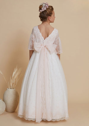 Vestido para comunión en color blanco de Amaya. Diseño de media manga con volantes y bordado de encaje, cuello redondo y cuerpo plisado. La espalda presenta escote en V con cierre de botones. Incluye lazo de tul rosa claro situado bajo el pecho para estilizar la figura y cinturón floral de aire lujoso. La falda larga, con sobrecapa de tul plumetti y bajo bordado, mantiene un precioso volumen gracias al cancán de 3 capas. Una pieza romántica y artesanal, fiel al ADN de la firma.