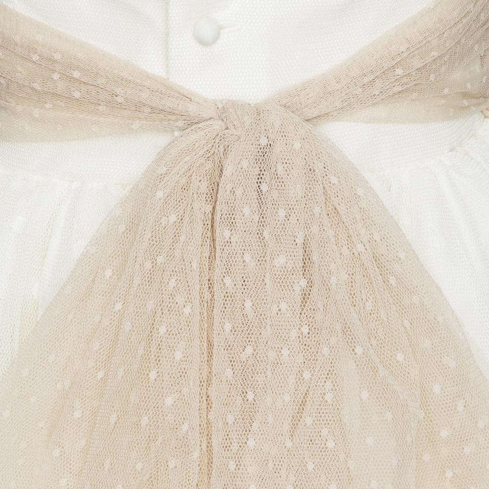 Vestido de comunión para niña en color blanco, de manga corta, con lazada de tul en tono nude. Cómodo y delicado, ideal para ocasiones especiales. Diseño exclusivo de Marla con confección artesanal en España y especial cuidado en los acabados.