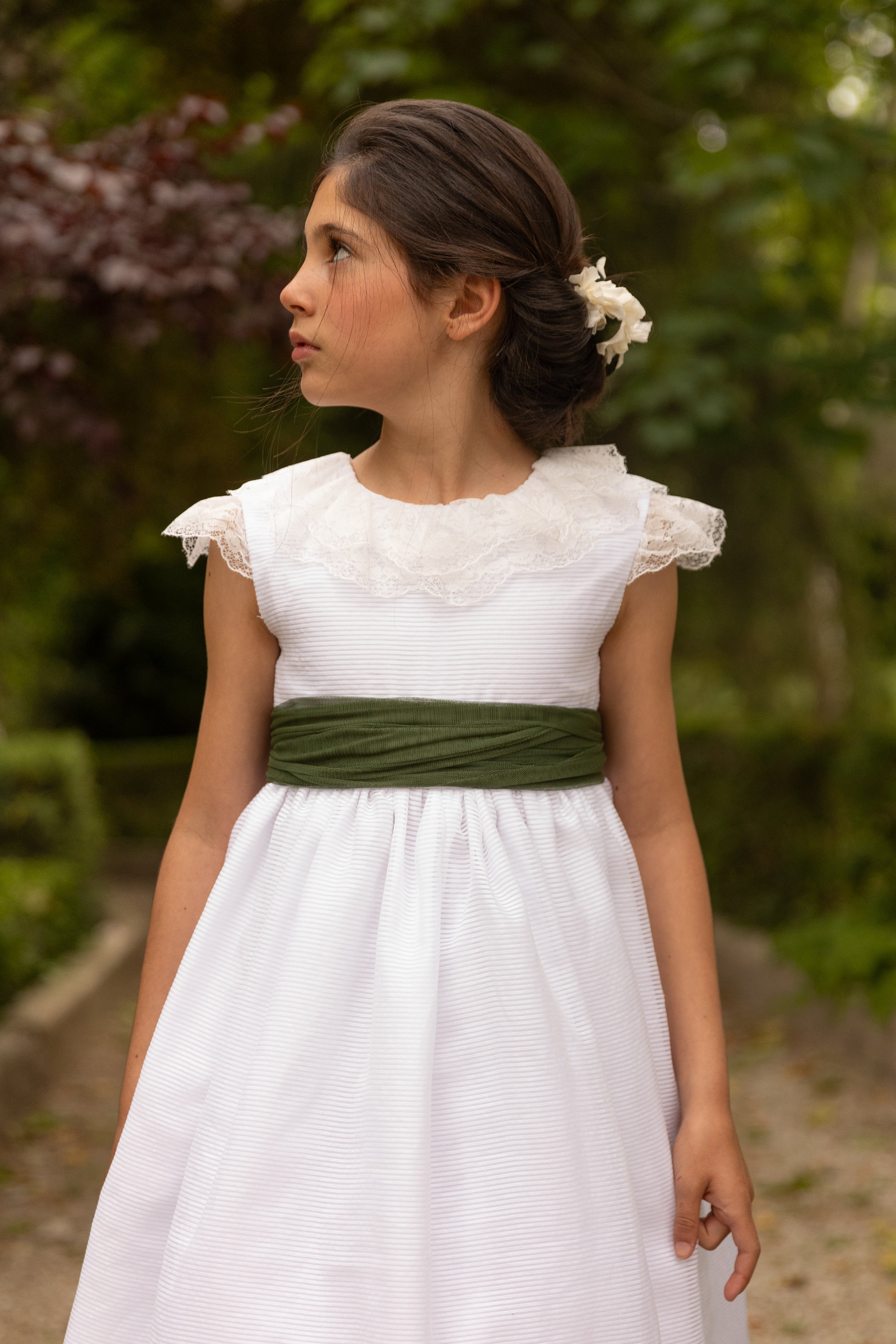 Vestido de comunión sin mangas, confeccionado íntegramente en tela rayada blanca. Presenta un doble cuello del mismo encaje que remata los hombros y continúa por la espalda para formar un espectacular escote en V. Incluye fajín. Un diseño sencillo y romántico.