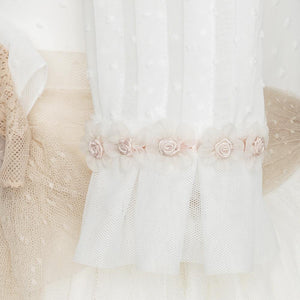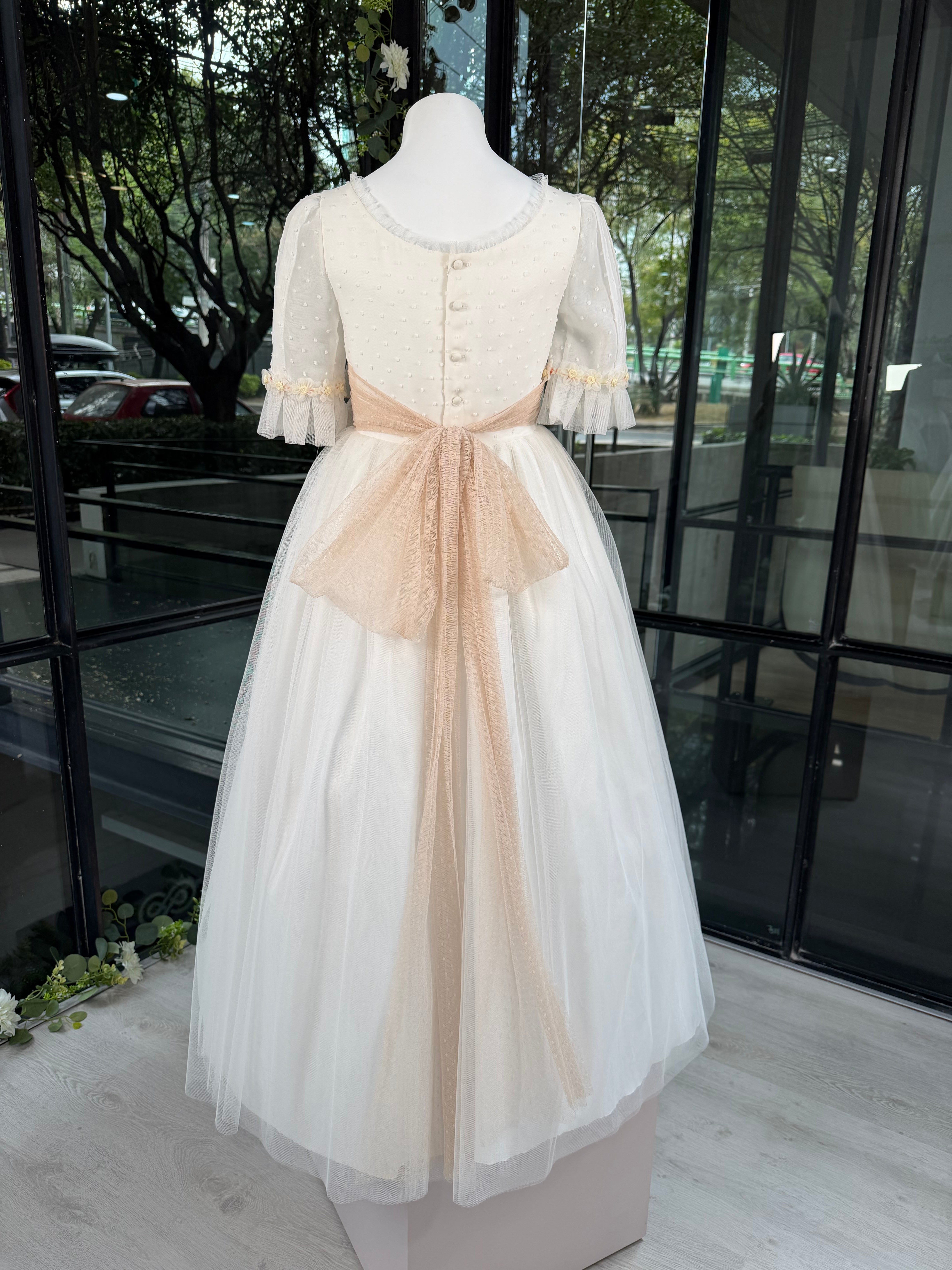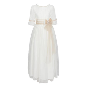 Vestido de Primera Comunión para niña en color blanco y manga al codo. Incorpora una lazada de tul en tono beige que aporta un toque delicado. Diseño cómodo y elegante, ideal para ocasiones especiales. Creación exclusiva de Marla, confeccionada artesanalmente en España con especial atención a los acabados.