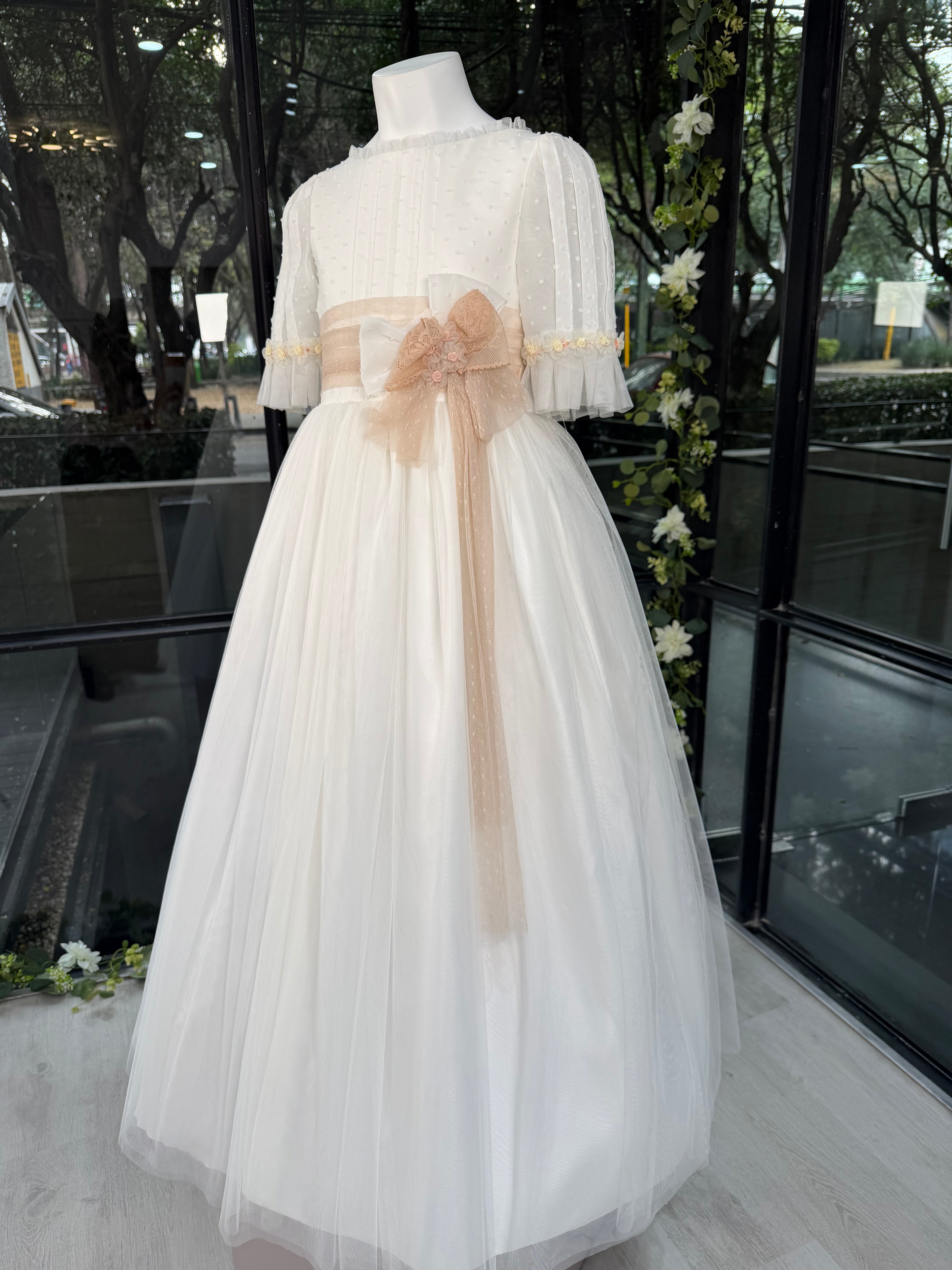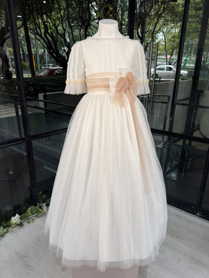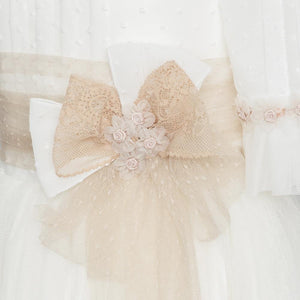 Vestido largo blanco con lazada beige para comunión - K111 - marca Marla