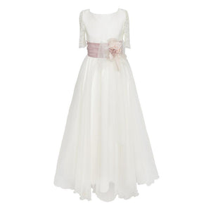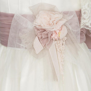 Vestido de Primera Comunión en tono beige, de manga al codo, con aplique floral y lazada de tul rosa que aportan un aire romántico. Diseño exclusivo de Marla, confeccionado artesanalmente en España con especial cuidado en los acabados; una opción cómoda y delicada para su gran día.