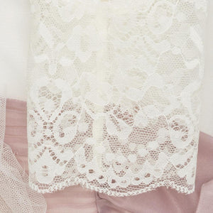 Vestido beige con flor y lazada de tul rosa