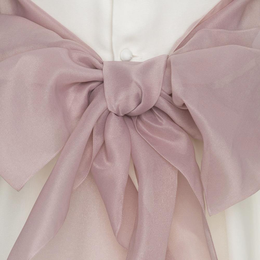 - Aplique floral con lazada de tul rosa.