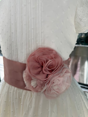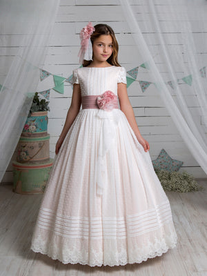 Vestido largo blanco con cinturón y falda en tonos rosa para comunión - L213 - marca Marla