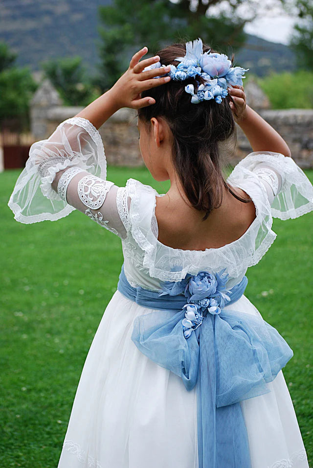 Vestido de comunión de color blanco y manga larga, con una falda larga que calle hasta el suelo. Es una prenda con detalles como el cuello del encaje y el escote cuadrado decorado con un bordado exclusivo y elegante a juego con el lazo para crear el aire bohemio. El vestido es pura delicadeza que tiene mangas de tela ligera y transparente decoradas con volantes a juego con la falda. Tiene un elaborado patrón vintage dibujado en el corset y el lazo detrás para estilizar la figura. Se lleva una corona de flores del mismo estilo.