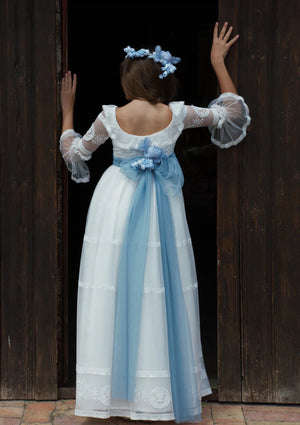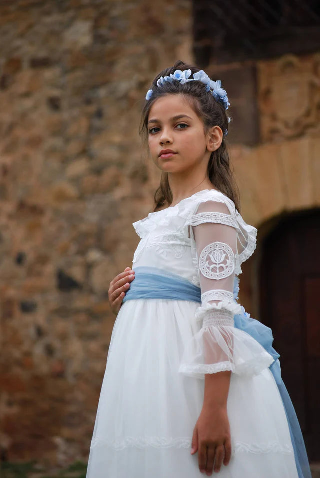 Vestido de comunión largo blanco con cinturón y corona azul SOL - marca Mon Air