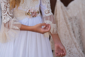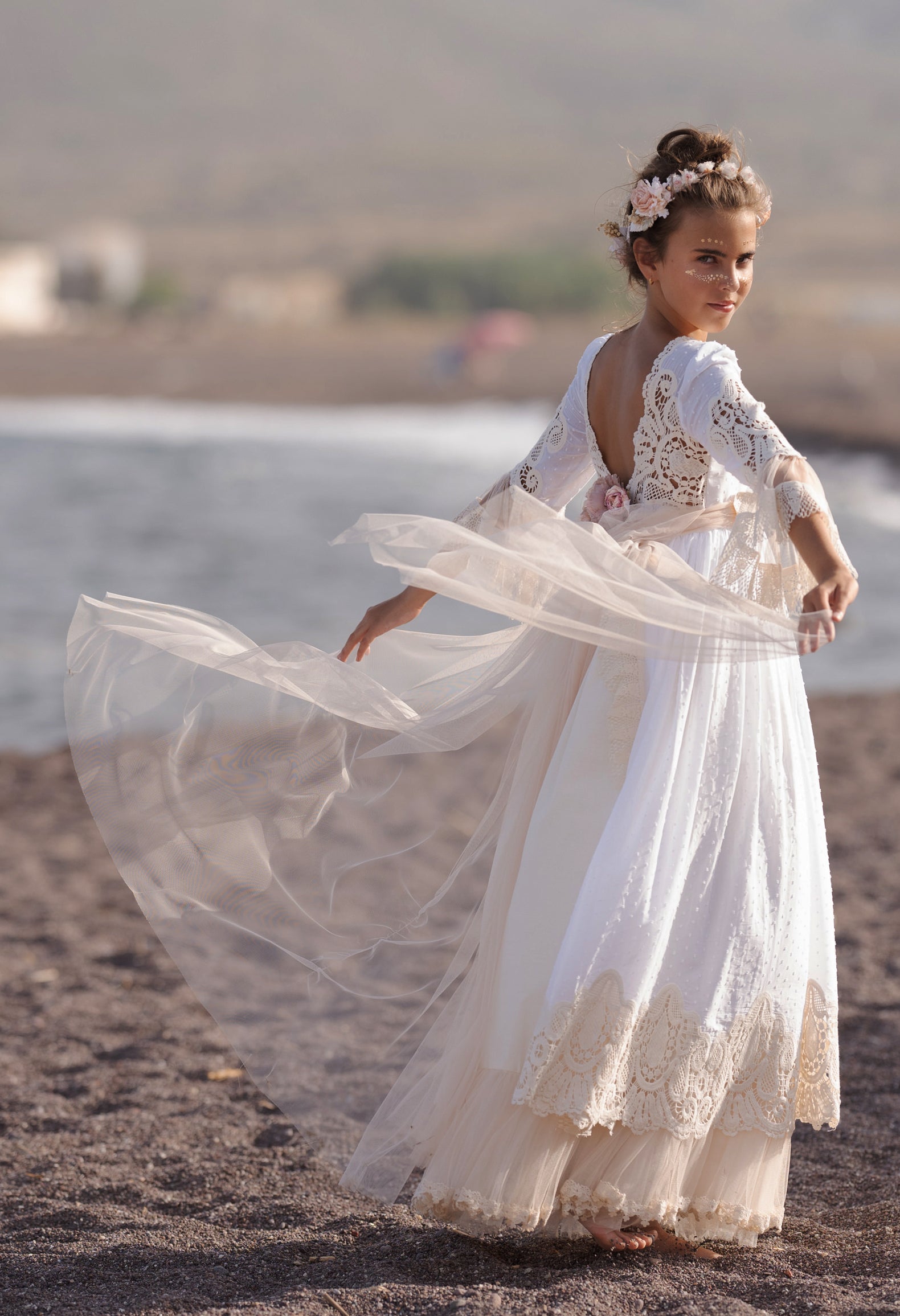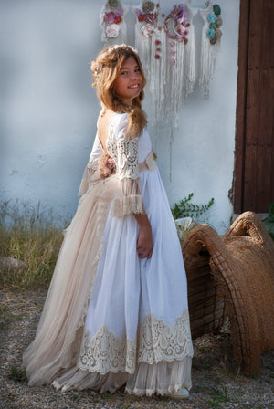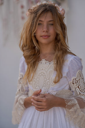 Vestido de comunión de color blanco con encaje color beige, de media manga, con una falda larga que calle hasta el suelo. Es una prenda con detalles como el cuello del encaje y el escote cuadrado decorado con un bordado exclusivo y elegante a juego con el lazo para crear el aire bohemio. El vestido es pura delicadeza que tiene mangas de tela ligera y transparente decoradas con volantes a juego con la falda. Tiene un elaborado patrón vintage dibujado en el corset y el lazo detrás para estilizar la figura. Se lleva una corona de flores del mismo estilo.