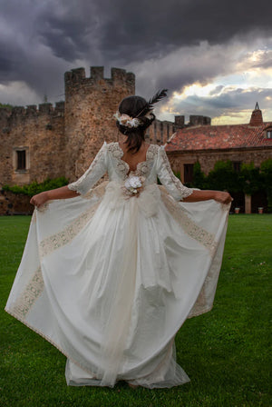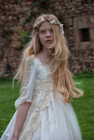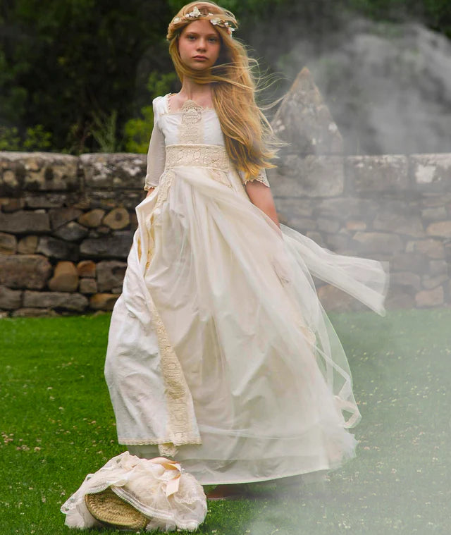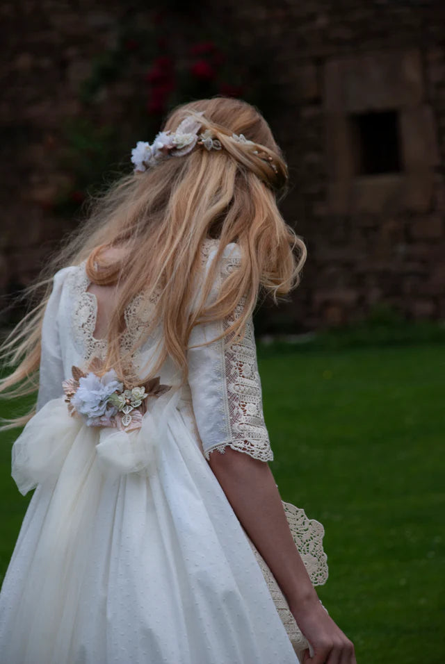 Vestido de comunión de color blanco con encaje color beige, de media manga, con una falda larga que calle hasta el suelo. Es una prenda con detalles como el cuello del encaje y el escote cuadrado decorado con un bordado exclusivo y elegante a juego con el lazo para crear el aire bohemio. El vestido es pura delicadeza que tiene mangas de tela ligera y transparente decoradas con volantes a juego con la falda. Tiene un elaborado patrón vintage dibujado en el corset y el lazo detrás para estilizar la figura. Se lleva una corona de flores del mismo estilo.