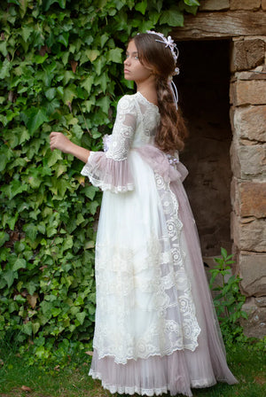 Vestido de comunión de color crudo con cinturón tono malva. Media manga transparente con bordado exclusivo y volantes. Falda larga que calle hasta el suelo. Es una prenda con detalles como el cuello del encaje y el escote cerrado decorado con un bordado a juego con el lazo para crear el aire bohemio. Tiene un elaborado patrón vintage dibujado en el corset y el lazo detrás para estilizar la figura. Diseño de Mon Air, con fabricación artesanal en España y materiales de alta calidad.