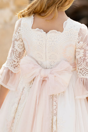 Diseño en tono rosa pastel con mangas de volantes. Destaca por el trabajo del cuerpo y la espalda con escote cuadrado en encaje, con cierre de cremallera. Una opción delicada y favorecedora.