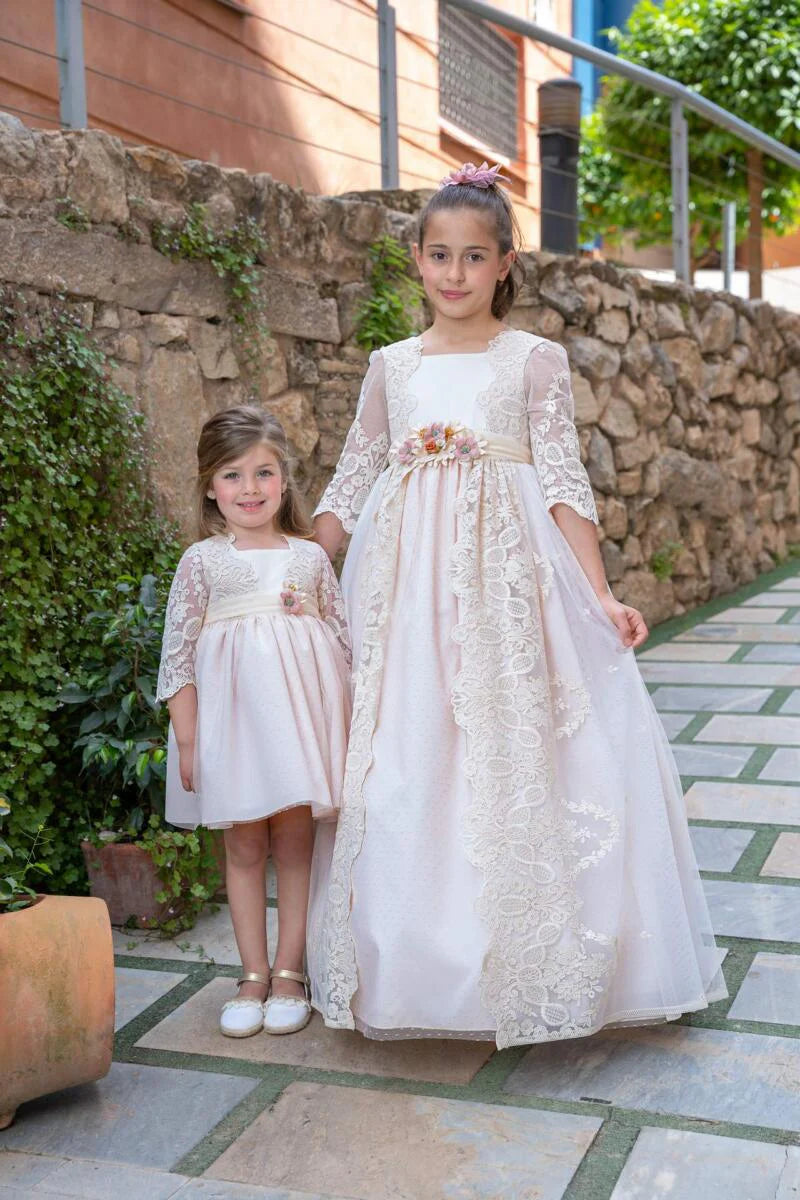 Vestido de comunión confeccionado en tul bordado, con paleta en topo y salmón. Diseño de manga francesa y cuerpo con trabajo artesanal; por debajo incorpora tul bordado en topo y salmón con detalle floral central. En la cintura, flores hechas a mano que realzan y armonizan el conjunto.