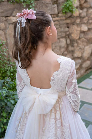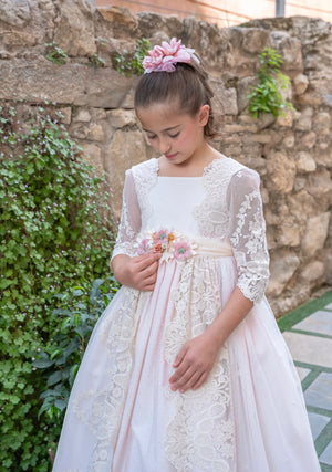 Vestido de comunión ANDREA en tul bordado en topo y salmón