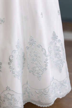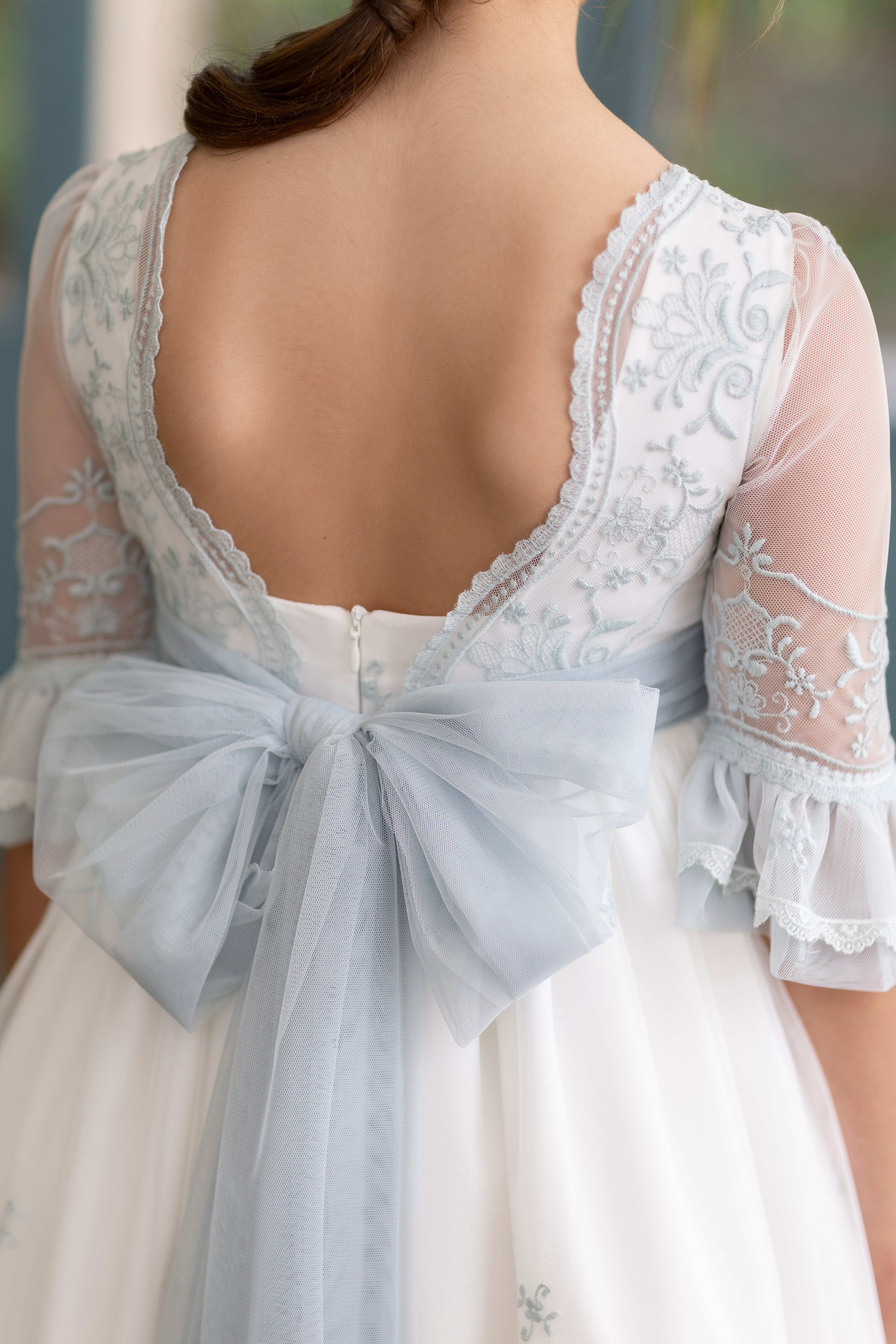 Vestido en tul bordado con capas en tono topo y verde aguamarina. De manga larga transparente con volantes y encaje. Espalda abierta decorada con encaje y cierre de cremallera invisible. La cintura se realza con un cinturón adornado con flores hechas a mano en las mismas tonalidades. Incluye corona de flores a juego.