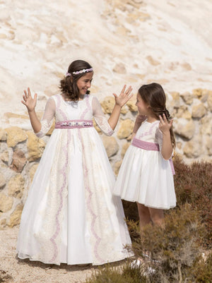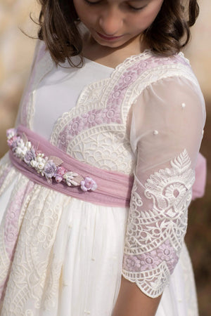 Vestido largo de comunión confeccionado en tul con tonos beige y bordado lila. Diseño con mangas francesas y trabajado detalle en el cuerpo. Lazo en la cintura adornado con flores al tono. Un color distinto y muy favorecedor.