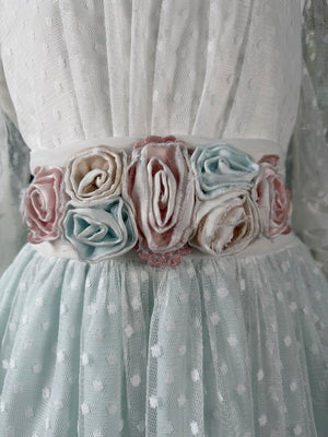 Vestido largo en tono celeste para Primera Comunión en tul plumetti, de manga al codo y aire romántico. Presenta lazada de tul blanco con flores multicolor y una falda larga y ligera en dos tonos y tres capas (tul plumetti blanco y satén celeste), con remates de encaje que armonizan con las mangas. Diseño exclusivo de Marla, confeccionado artesanalmente en España con especial cuidado en los acabados.