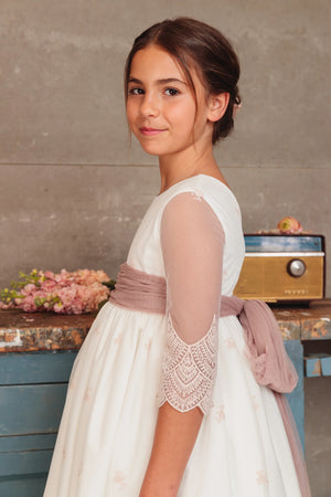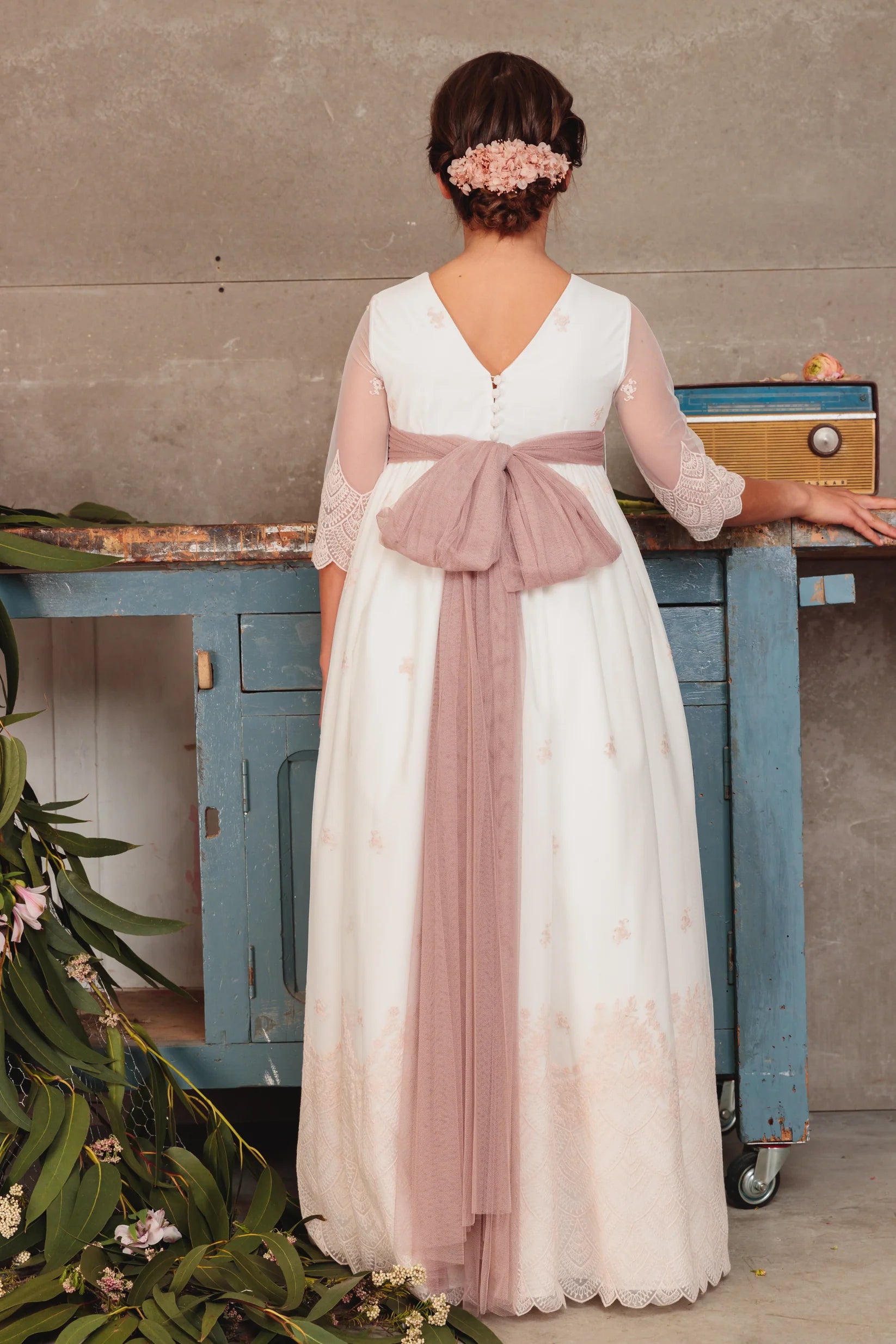Vestido de comunión en color blanco confeccionado en tul, con manga media decorada con bordado floral y lazada de tul en rosa empolvado. Falda larga hasta el suelo con bordado a juego, cuello redondo y escote abierto. Diseño cómodo y delicado, con opción de personalizar la lazada en color y tejido. Disponible en múltiples tallas y posibilidad de confección a medida.