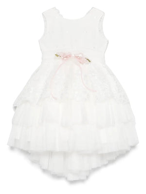 Vestido para eventos sociales en color blanco con manga corta y falda tipo tutú asimétrica: corta al frente y larga en la parte posterior. La falda de varios capas vaporosas, crea un marcado efecto princesa. Espalda cerrada con lazada cruzada de tul blanco; el cuerpo lleva encaje en el corsé y en la cintura un lazo bicolor (rosa y blanco) adornado con flores al frente. Diseño elegante de Mimilú, con acabados de alta calidad y confección artesanal Española.