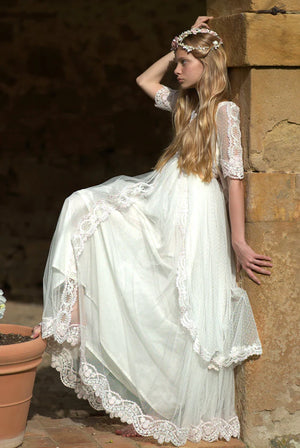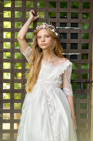 Vestido de comunión largo blanco lazado rosa y encaje rosa LUNA ROSA (sin corona) - marca Mon Air