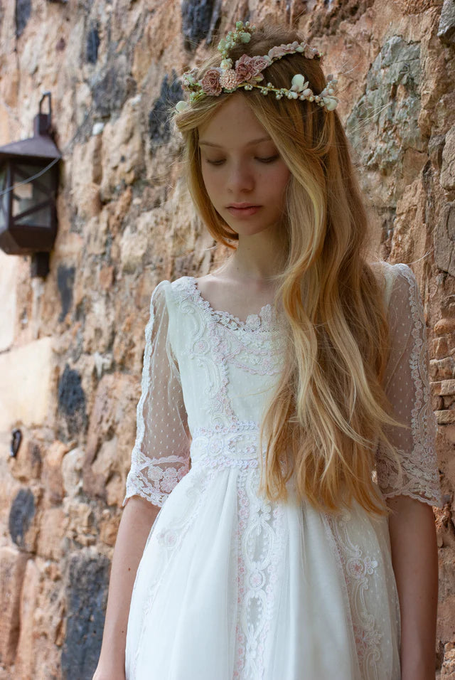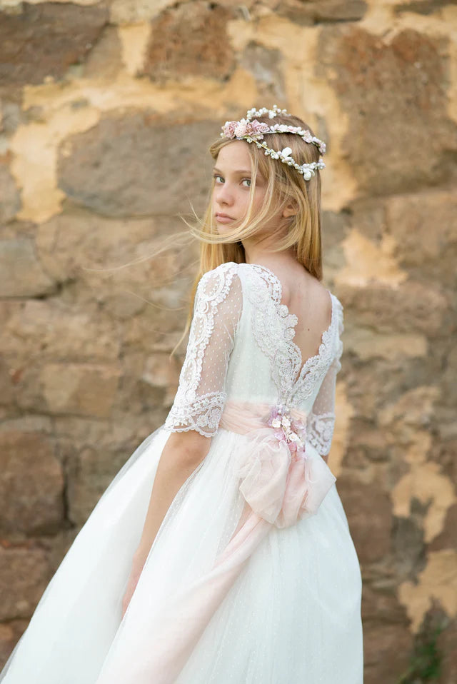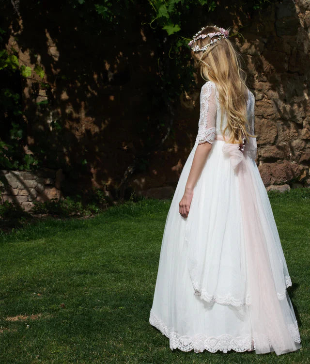 Vestido de comunión de color blanco con lazada de color rosa, de media manga, con una falda larga que calle hasta el suelo. Es una prenda con detalles como el cuello del encaje y el escote cerrado decorado con un bordado exclusivo y elegante a juego con el lazo para crear el aire bohemio. El vestido es pura delicadeza que tiene mangas de tela ligera y transparente decoradas con volantes a juego con la falda. Tiene un elaborado patrón vintage dibujado en el corset y el lazo detrás para estilizar la figura.