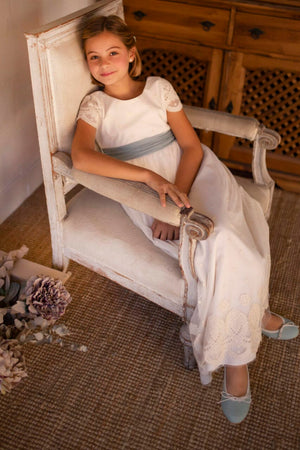 Vestido para Primera Comunión de la marca Coordinanos, con manga corta bordada y lazada de tul verde en la cintura. Una pieza cómoda y delicada, ideal para ocasiones especiales, confeccionada en España con materiales de alta calidad.