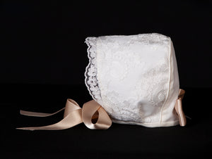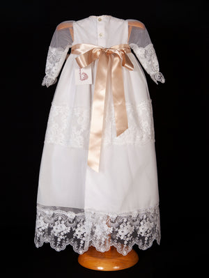 Faldón (ropón) clásico de bautizo de la marca Mimosines. Color blanco con gorro y zapatitos. Liston satinado color beige dorado. Mangas rematadas con volante de encaje y falda larga para un look elegante y tradicional.
