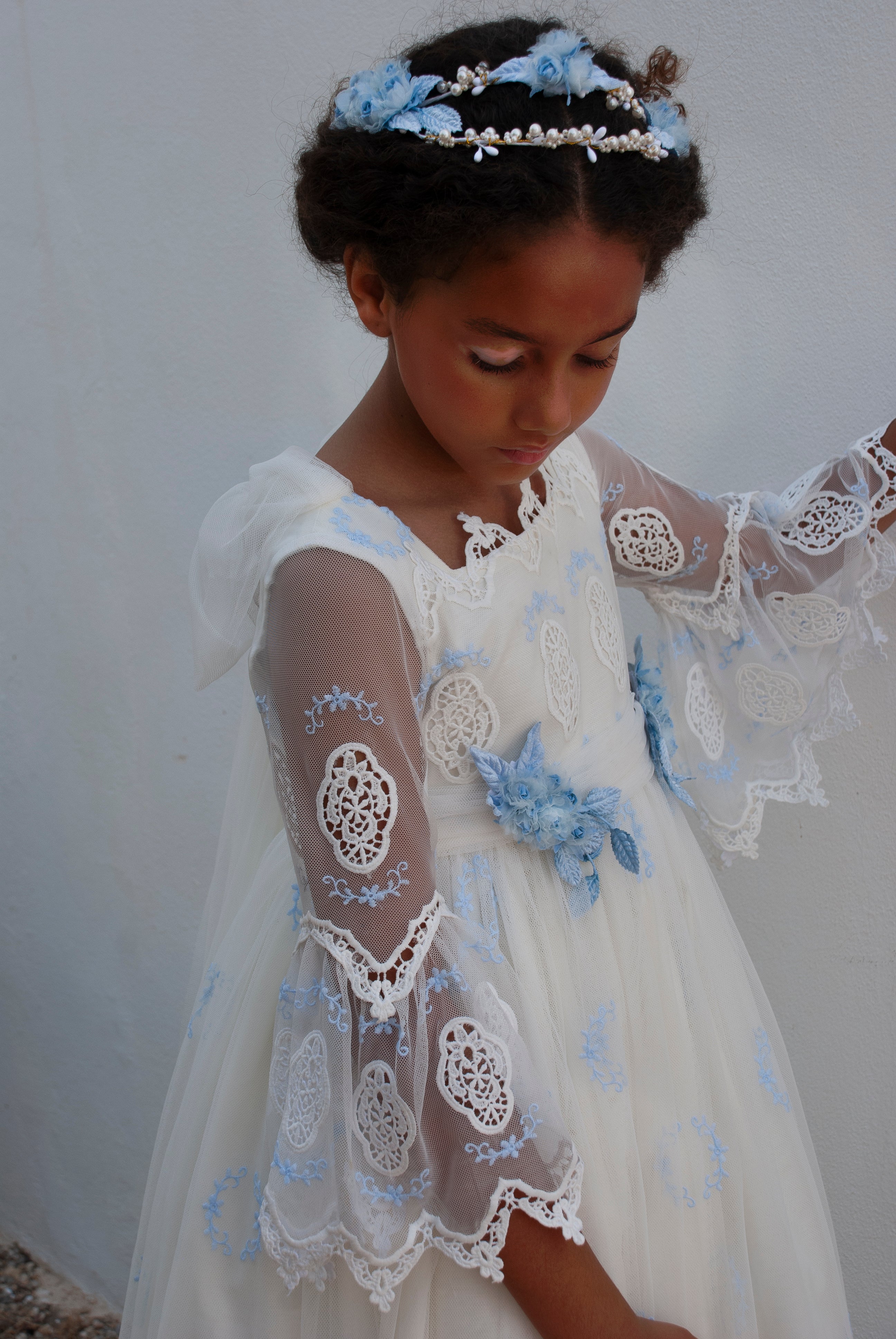 Vestido de comunión de color blanco con encaje color azul, de media manga, con una falda larga que calle hasta el suelo. Es una prenda con detalles como el cuello del encaje y el escote cuadrado decorado con un bordado exclusivo y elegante a juego con el lazo para crear el aire bohemio. El vestido es pura delicadeza que tiene mangas de tela ligera y transparente decoradas con volantes a juego con la falda. Tiene un elaborado patrón vintage dibujado en el corset y el lazo detrás para estilizar la figura. Se lleva una corona de flores del mismo estilo.