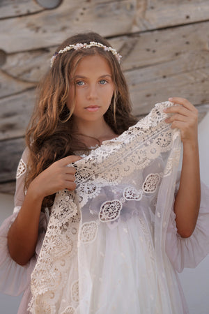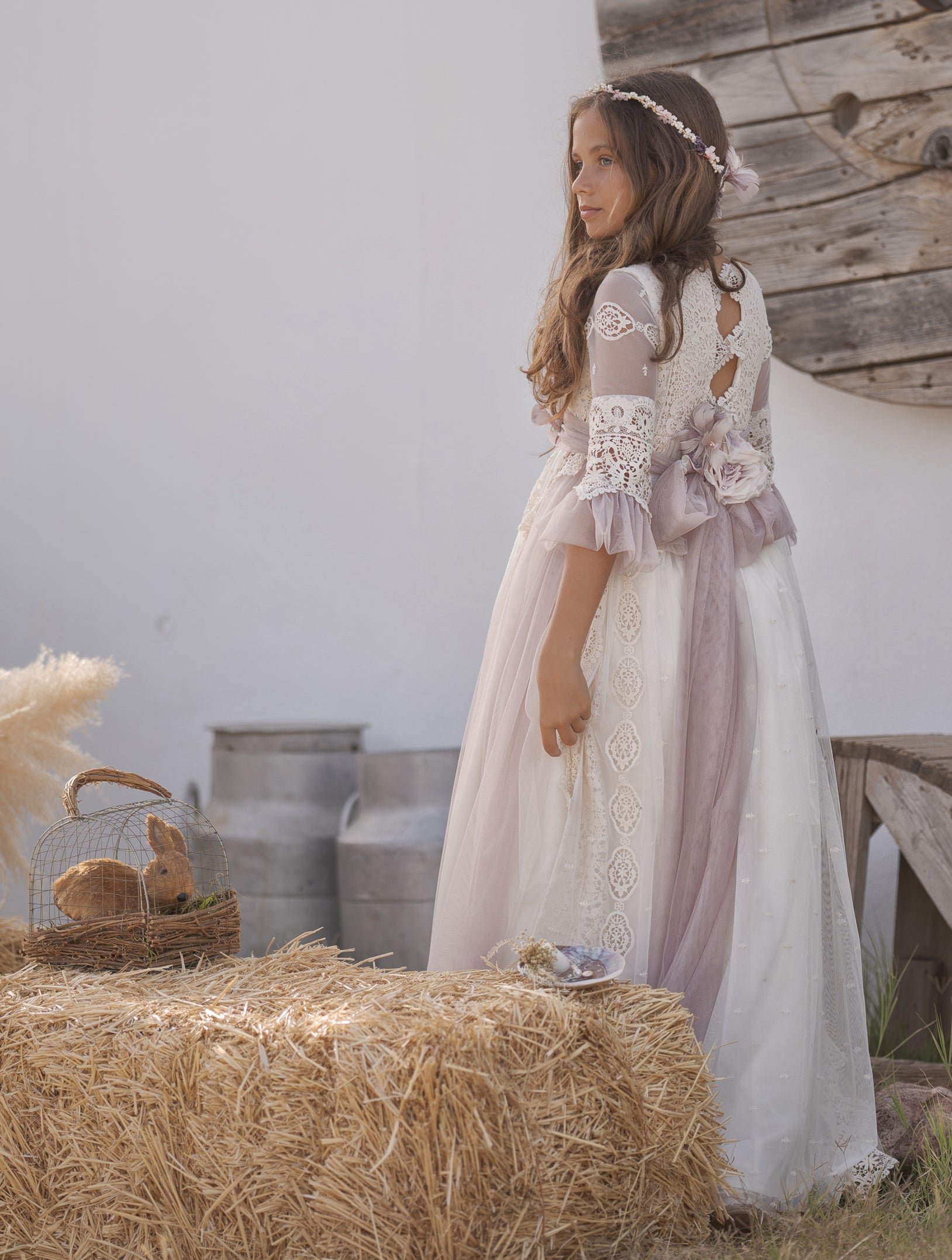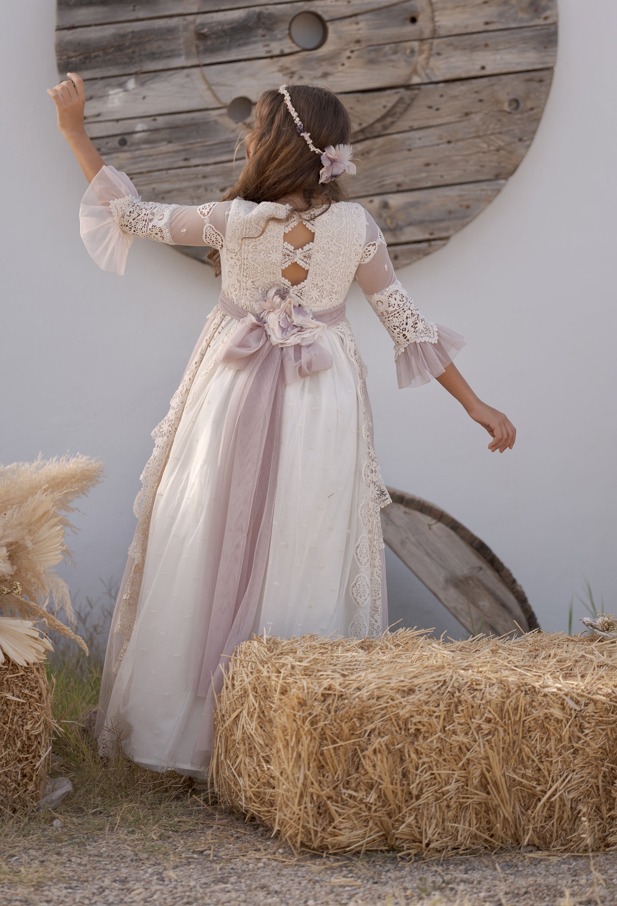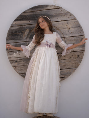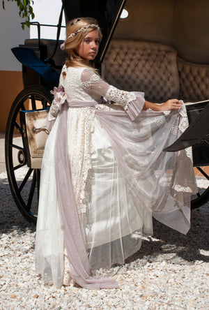 Vestido de comunión de color crudo con cinturón tono lila, de media manga, con una falda larga que calle hasta el suelo. Es una prenda con detalles como el cuello del encaje y el escote cerrado decorado con un bordado exclusivo y elegante a juego con el lazo para crear el aire bohemio. El vestido es pura delicadeza que tiene mangas de tela ligera y transparente decoradas con volantes a juego con la falda. Tiene un elaborado patrón vintage dibujado en el corset y el lazo detrás para estilizar la figura.