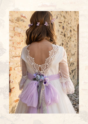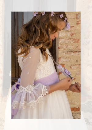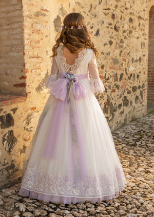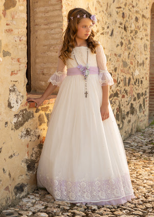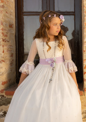 Vestido para comunión en color blanco con media manga y lazada lila. Presenta cuello redondo, cuerpo con patrón vintage de encaje y una falda larga que cae hasta el suelo con el bajo bordado. Las mangas, de tejido ligero y transparente, están decoradas con volantes y encaje. La espalda abierta en V cierra con botones. Incluye corona de flores y rosario a juego.